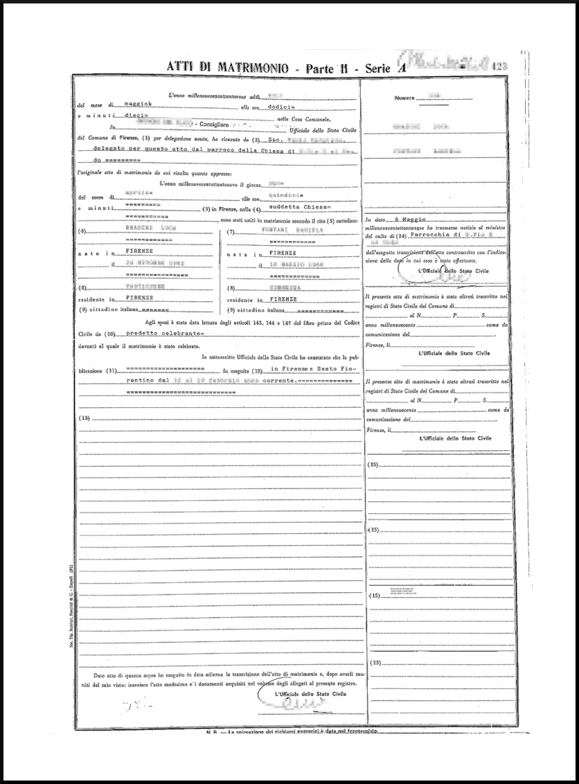 L’atto di matrimonio originale è un documento che viene redatto al momento delle nozze e inviato all’ufficiale di stato civile del comune dove si è celebrato il matrimonio. La copia integrale dell’atto di matrimonio è una fotocopia fedele di questo documento. Nella copia integrale dell’atto di matrimonio ci sono questi dati: