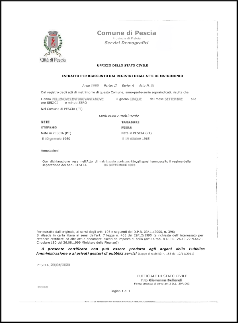 N.B. Per legalizzare il documento, l’Estratto di matrimonio e l’Estratto multilingue possono essere apostillati dalla Prefettura competente. Per richiedere l’apostilla, basta selezionare l’opzione “richiedi con apostille” nel form e la richiesta arriverà direttamente ai nostri sistemi.