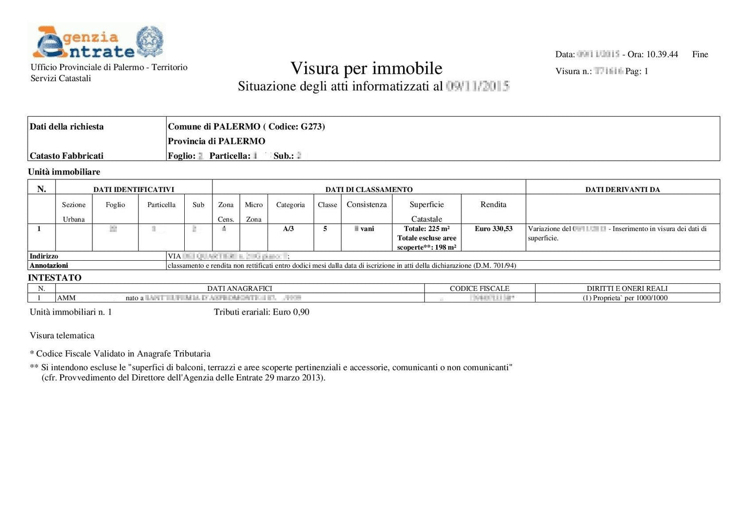 Visura Catastale su Soggetto: Fornisce i dati anagrafici dell’intestatario del terreno/fabbricato e i dati identificativi e di classamento dei terreni e fabbricati a cui sono intestati.